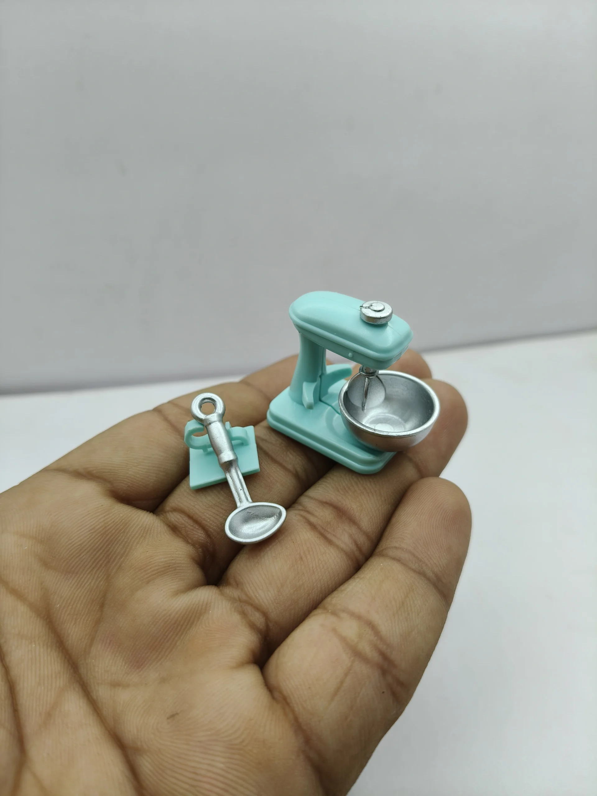 Miniature kitchen hand mixer designed for ultimate realism. Featuring classic styling, it brings your dollhouse bakery scenes to life.